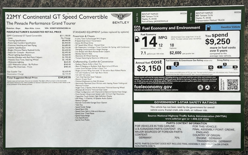 - Front tires: 275/35YR22.0